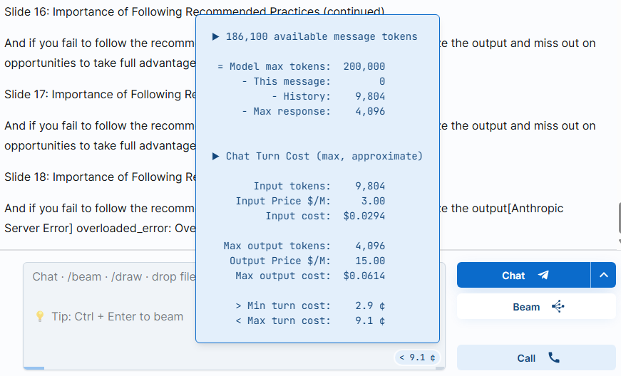 Big-AGI stands out for its comprehensive feature set and privacy-focused approach. It offers a hassle-free, private, and powerful experience for users seeking robust chat capabilities with minimal configuration. It is packed with practical features. The Chat Input area has a visual indicator showing how much context has been used, as well as a Chat Cost calculator.
