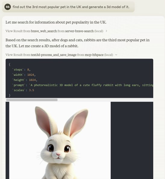 Claude can combine results from different MCP servers. This example shows Claude searching the Web and generating a 3D Model from the search result.